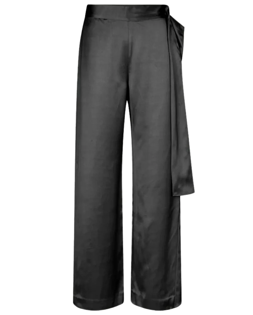 These trousers have a relaxed, slightly flared silhouette with a draped belted detail and comfortable high waist.