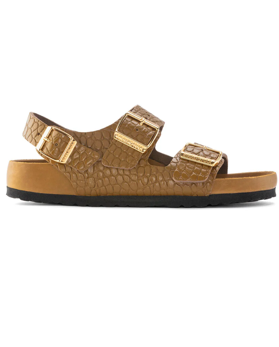 The BIRKENSTOCK Milano now features a reptile leather look and feel and a compact design with an ankle strap. The metal pin buckles are individually adjustable with color-coordinated detailing. The exquisite footbed is fully lined with soft piumato leather, making it exceptionally comfortable. The upper is made from embossed natural leather.
