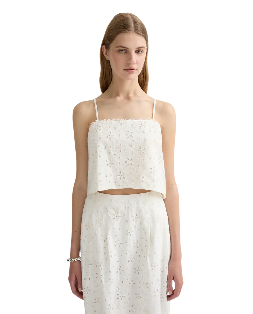 The Salma Top features delicate all-over embroidery and a trimmed neckline. Designed to sit at a flattering cropped length, it includes adjustable straps and a concealed zip closure.Â