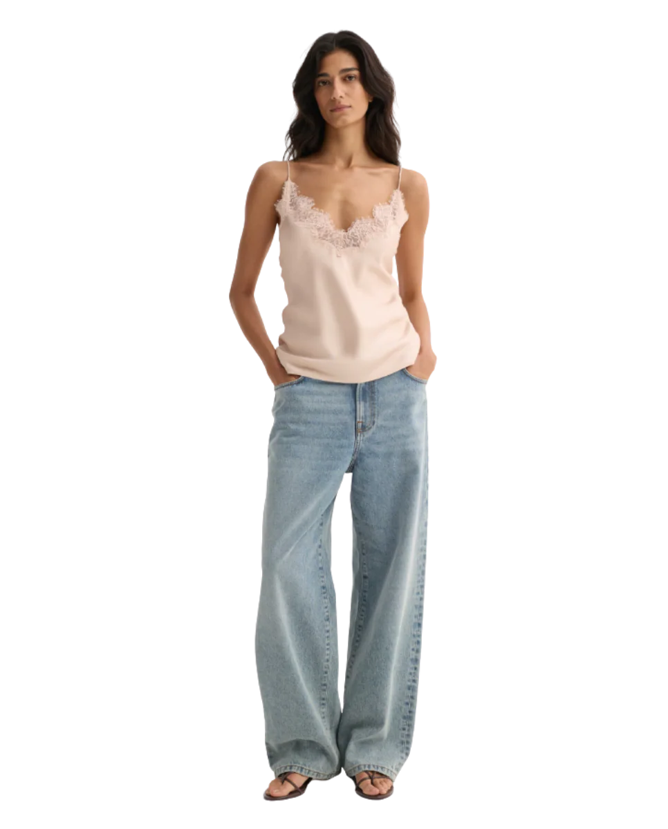 A silk camisole with lace detailing along the neckline and back. Finished with thin adjustable straps that extend cleanly down the back for an elegant, refined look.