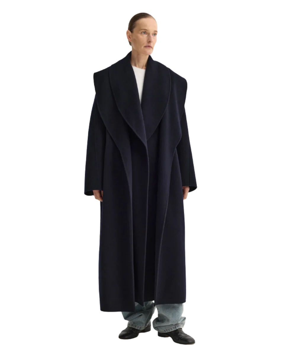 A standout wool coat featuring a striking double-layered scarf collar. Designed with a long, tailored silhouette, double-breasted closure, and side pockets for a sophisticated everyday layer.