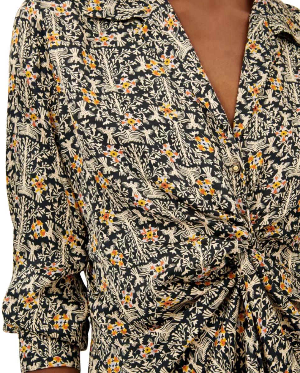 Short shirt dress with front knot-effect detail in a fluid satin print, finished in Italy, exclusive SESSUN pattern.